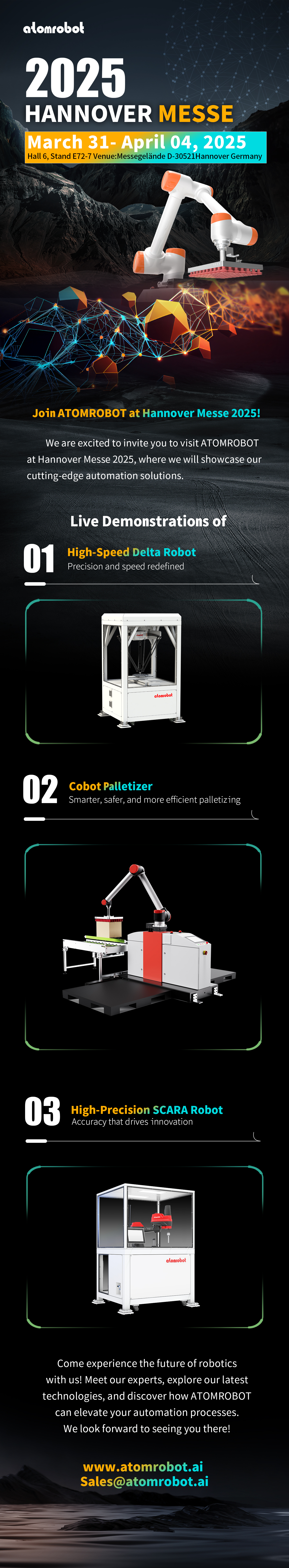 3月31日-4月4日,全球工業(yè)技術(shù)風(fēng)向標(biāo)——漢諾威工業(yè)博覽會(HANNOVER MESSE 2025)在德國盛大進(jìn)行。這場匯聚60個國家及地區(qū)、超4,000家參展商的頂級展會,僅中國軍團(tuán),就有16,000㎡規(guī)模展區(qū),華為、上海電氣、國家能源等企業(yè)展示硬核技術(shù)實力的同時,全球工業(yè)機(jī)器人服務(wù)商——阿童木機(jī)器人(AtomRobot)攜智能分揀包裝碼垛解決方案驚艷亮相。本次展會是阿童木繼2025韓國AW展后的第二場國際展。
