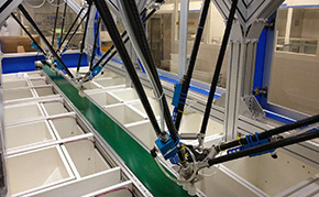 基于并聯(lián)機(jī)器人的柔性優(yōu)勢,阿童木機(jī)器人自主研發(fā)生產(chǎn)的并聯(lián)機(jī)器人自動(dòng)裝箱單元,利用并聯(lián)機(jī)器人快速、高效、精準(zhǔn)的特點(diǎn),以此為紐帶與開箱機(jī)和封箱機(jī)無縫連接,在傳統(tǒng)裝箱機(jī)的基礎(chǔ)上增加高速并聯(lián)機(jī)器人,將傳統(tǒng)工廠生產(chǎn)線上裝箱環(huán)節(jié)需要的大量人工解放出來。